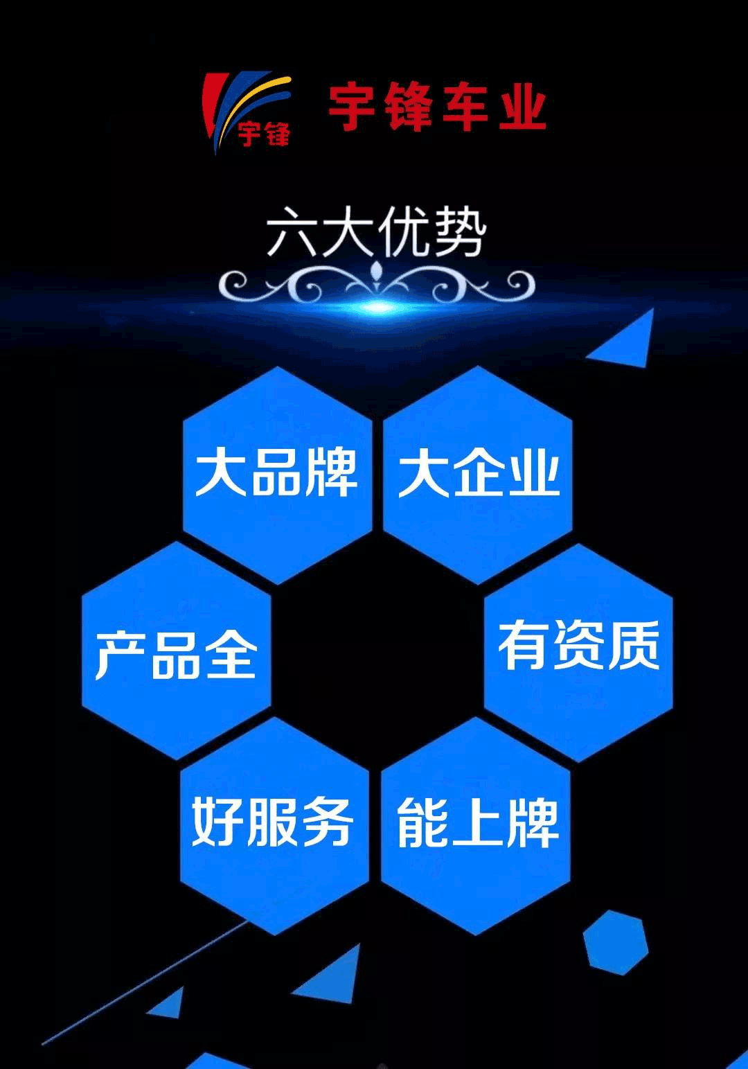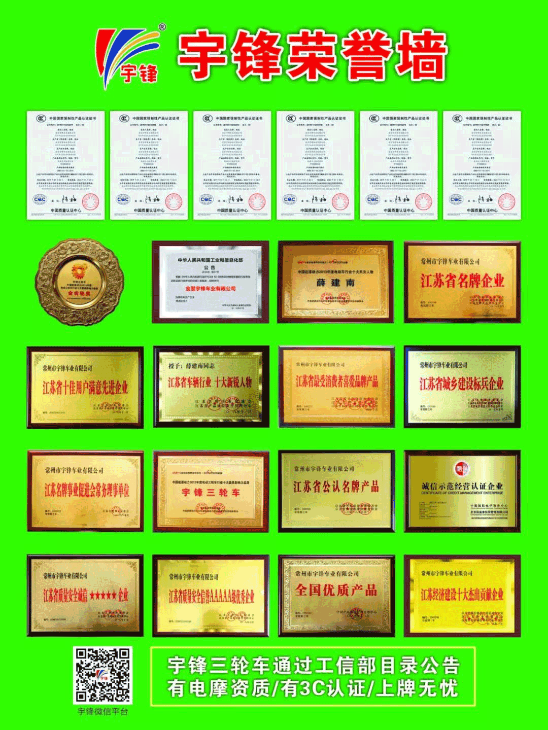 宇鋒現有二十多款車(chē)型通過工(gōng)信部目錄公告。産品獲得(de)國(guó)家3C認證,宇鋒三輪車(chē)能上牌,放心買!更多産品請(qǐng)浏覽:宇鋒官網:www.cnyufeng.com