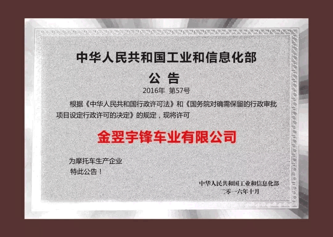 2016年,宇鋒獲得(de)摩托車(chē)生(shēng)産企業(yè)資質,這是行業(yè)較早一(yī)批獲得(de)摩托車(chē)生(shēng)産企業(yè)資質的品牌,也(yě)是行業(yè)較早一(yī)批獲得(de)國(guó)家3C認證産品的企業(yè)。摩企資質和電摩資質,是通向未來電動車(chē)規範化(huà)(huà)發展的金(jīn)鑰匙。