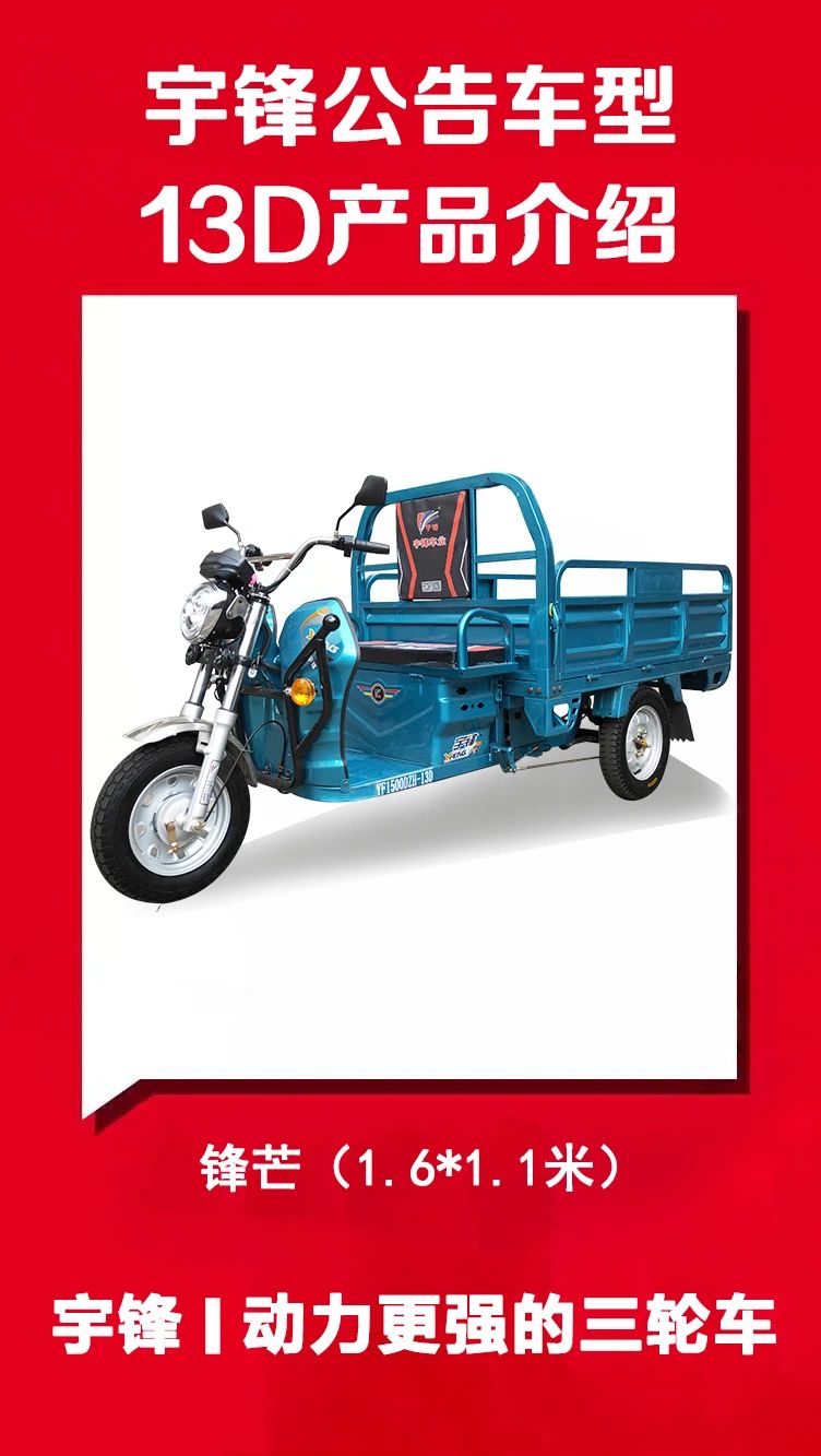 【評論】公告車(chē)13D由于其車(chē)型大小适中(zhōng),1.6米的車(chē)廂長(cháng)度,是三輪車(chē)行業(yè)的最常見(jiàn)通用車(chē)型,和12D(1.3米鋒泰,三開(kāi)門車(chē)型)形成完美(měi)的搭配,本車(chē)具有動力強、通用性好、車(chē)廂加筋加固、安全系數高和駕乘方便的幾個(gè)特色,深受終端消費者的好評,也(yě)是一(yī)款性價比非常高的一(yī)款通用車(chē)型。