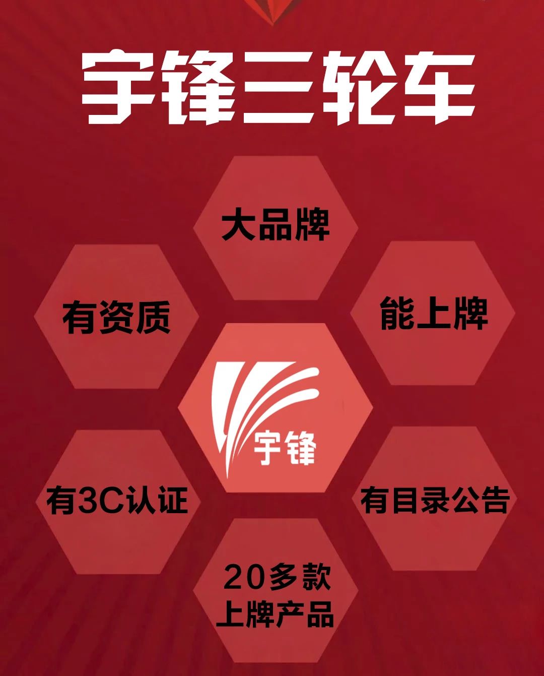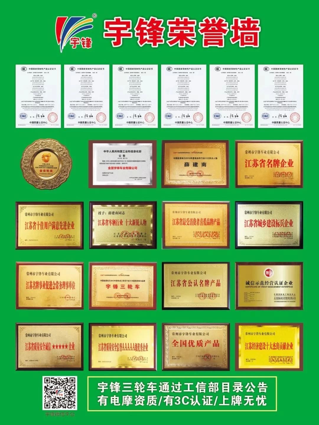 電動車(chē)上牌已經是一(yī)種趨勢,有資質、能上牌是一(yī)種必備。如同兩輪車(chē)新國(guó)标一(yī)樣,三輪上牌是必然的産物。而宇鋒擁有全系列二十多種可上牌車(chē)型,必将在後續市(shì)場握有主動權。